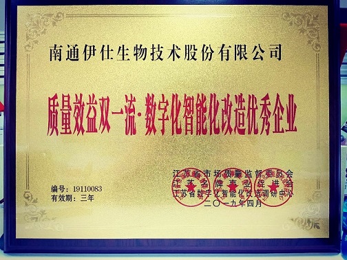 經(jīng)江蘇省市場質量監(jiān)督委員會、江蘇省數(shù)字化智能化改造調研中心、江蘇名牌事業(yè)促進會綜合調查審核評議,南通伊仕生物技術股份有限公司符合江蘇省質量效益雙一流·創(chuàng)新驅動轉型升級優(yōu)秀企業(yè)的條件,被評為《江蘇省質量效益雙一流·創(chuàng)新驅動轉型升級優(yōu)秀企業(yè)》。