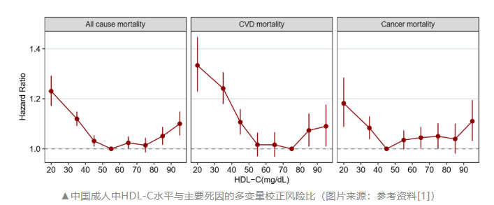 在校正潛在混雜因素后,研究者觀察到HDL-C與全因死亡率、CVD死亡率和癌癥死亡率呈U形相關(guān)。在HDL-C水平為50 mg/dL~79 mg/dL組中,全因和CVD死亡率風(fēng)險最低。HDL-C水平為40 mg/dL~49 mg/dL組的癌癥死亡率最低。與參考水平50 mg/dL~59 mg/dL相比,HDL-C<30 mg/dL的受試者比極高HDL-C水平(>90 mg/dL)的受試者具有相對更高的全因死亡風(fēng)險(HR 1.23,95% CI:1.17~1.29 vs. HR 1.10,95% CI:1.05~1.15)。