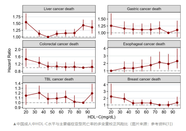 關(guān)于位點特異性癌癥,研究者僅在HDL-C和肝癌死亡率之間發(fā)現(xiàn)了U形關(guān)聯(lián)。與參考水平40 mg/dL~49 mg/dL相比,HDL-C<30 mg/dL(HR 1.55,95% CI:1.28~1.87)和>80 mg/dL(HR高于1.35,95% CI高于1.10)與肝癌死亡風(fēng)險較高相關(guān)。此外,HDL-C<40 mg/dL(HR 高于 1.90,95% CI 高于 1.20)受試者的乳腺癌死亡率顯著更高,而HDL-C>70 mg/dL的受試者的食管癌死亡率顯著更高(HR高于1.90,95% CI高于1.10)。