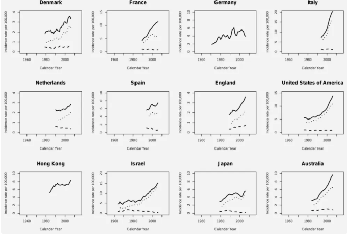 1960 年至 2007 年,在不同國家和地區(qū),男性甲狀腺癌發(fā)病率的總體趨勢呈明顯上升,圖片來源:參考文獻[4]