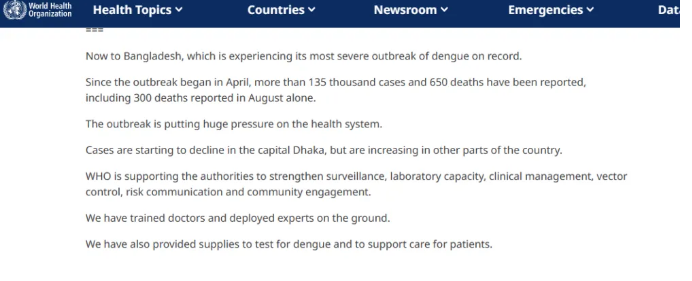 世衛(wèi)組織(WHO)周三表示,孟加拉國正在經歷有記錄以來最嚴重的登革熱疫情,自4月份疫情爆發(fā)以來,該國報告了超過13.5萬例登革熱病例,已有650多人死亡。