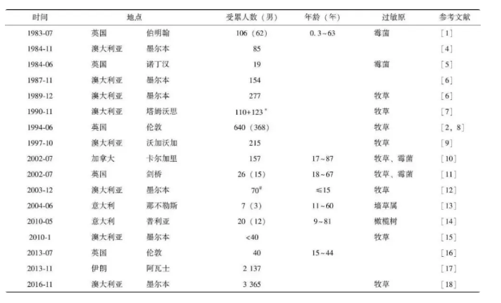 此后,陸續(xù)在全球范圍內(nèi)均有雷暴哮喘事件的相關(guān)報(bào)道,主要發(fā)生在英國(guó)、澳大利亞,另外加拿大、意大利、伊朗等國(guó)家也有類似報(bào)道。(下方表格中總結(jié)了自1983年以來(lái)文獻(xiàn)報(bào)道過(guò)的雷暴哮喘事件)