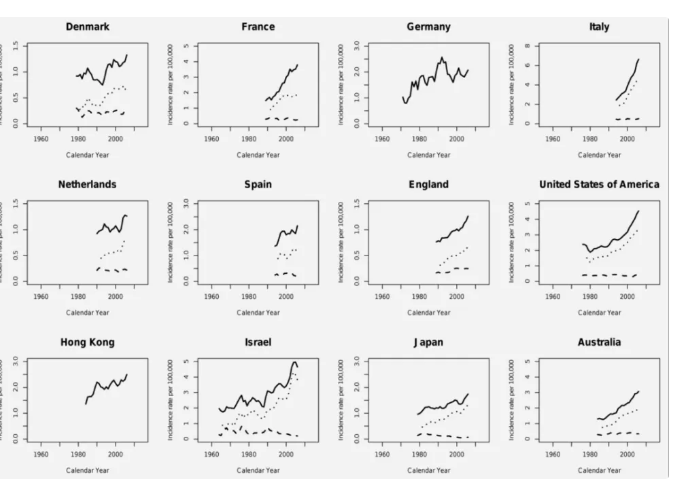 1960 年至 2007 年,在不同國家和地區(qū),男性甲狀腺癌發(fā)病率的總體趨勢呈明顯上升,圖片來源:參考文獻[4]