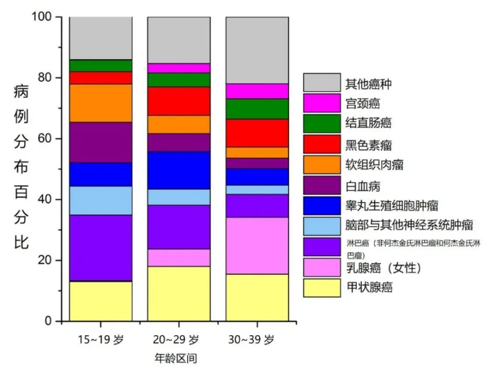 2012 年至 2016 年青少年和青壯年主要癌癥類型的病例分布(%),圖片來源:參考文獻[5]